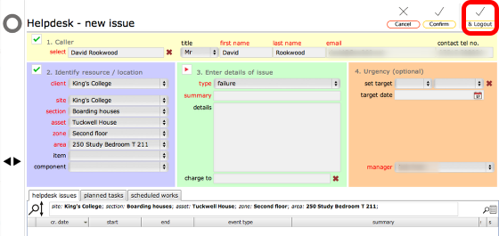 When you log a new Helpdesk issue you have the option of saving the issue and logging out all in one go by using the Confirm & Logout button, top right.