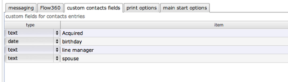 On this tab you can set up additional labels and data types that you would like to use on your own or others contacts cards. This information is only ever visible to you - each user of Flow360 can have their own independent (and completely private) sets of custom data that they can use on any contact cards that they have access to.