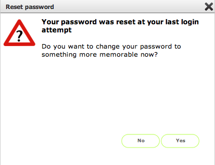 As you have just logged in with an auto issued (and not very memorable!) password you have the option on your first login to reset your password immediately. Click Yes to proceed. Click No to continue with the auto issued password.