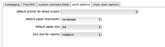 The print options tab allows to set up defaults for report outputs and to select a default printer if there is one available on your system.