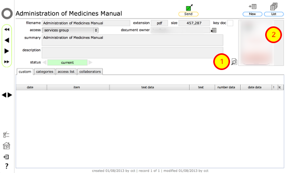 The document card gives more detail about the document. Open the document by clicking the View button (1) or clicking on the document thumbnail itself (2)