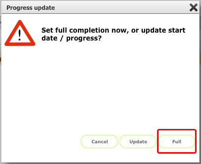 You have the option of updating the start date or progress of the works, or simply confirming start, completion and sign-off in one operation. For this quick sign-off example we are going to sign-off in full so click the Full button